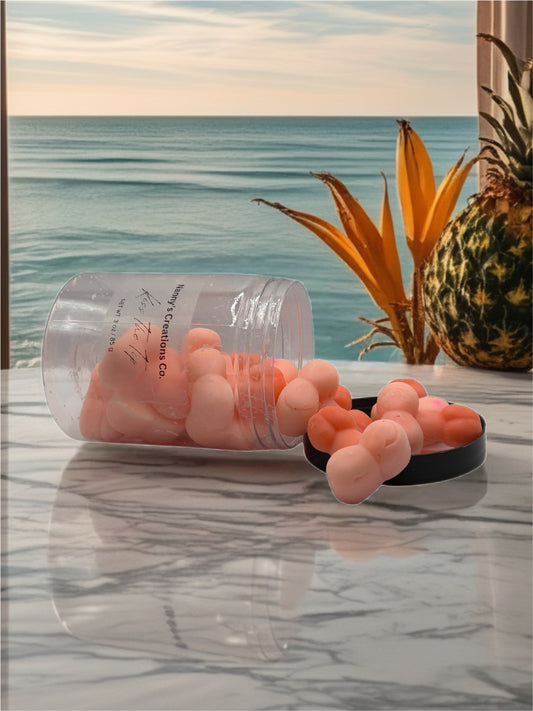 “Bahama Bust” – The essence of paradise. This scent bursts with the energizing fizz of citrus and sweet pineapple. As it unfolds, a decadent cocktail of tropical papaya and mango emerges, finally melting into the creamy, comforting embrace of coconut, vanilla, and skin-hugging musk.